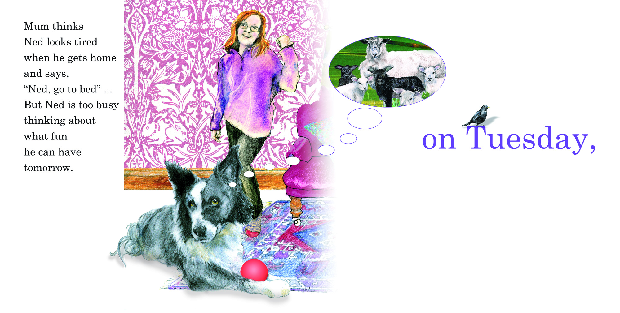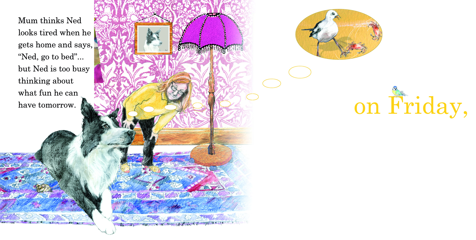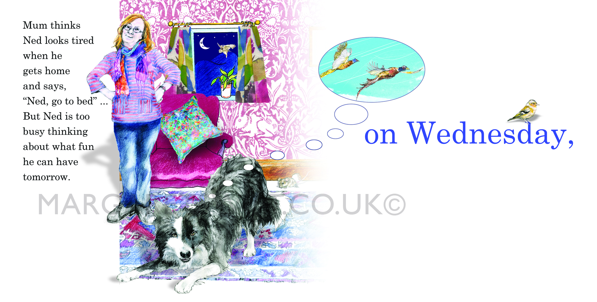 Introducing Ned – the very inquisitive dog who just will not go to bed; his mind is too full of the fantastic things he will be doing tomorrow …