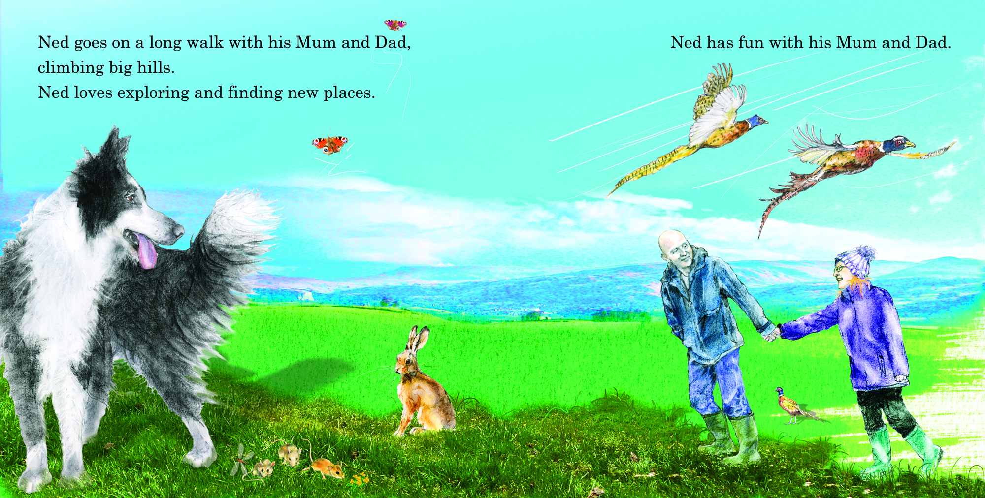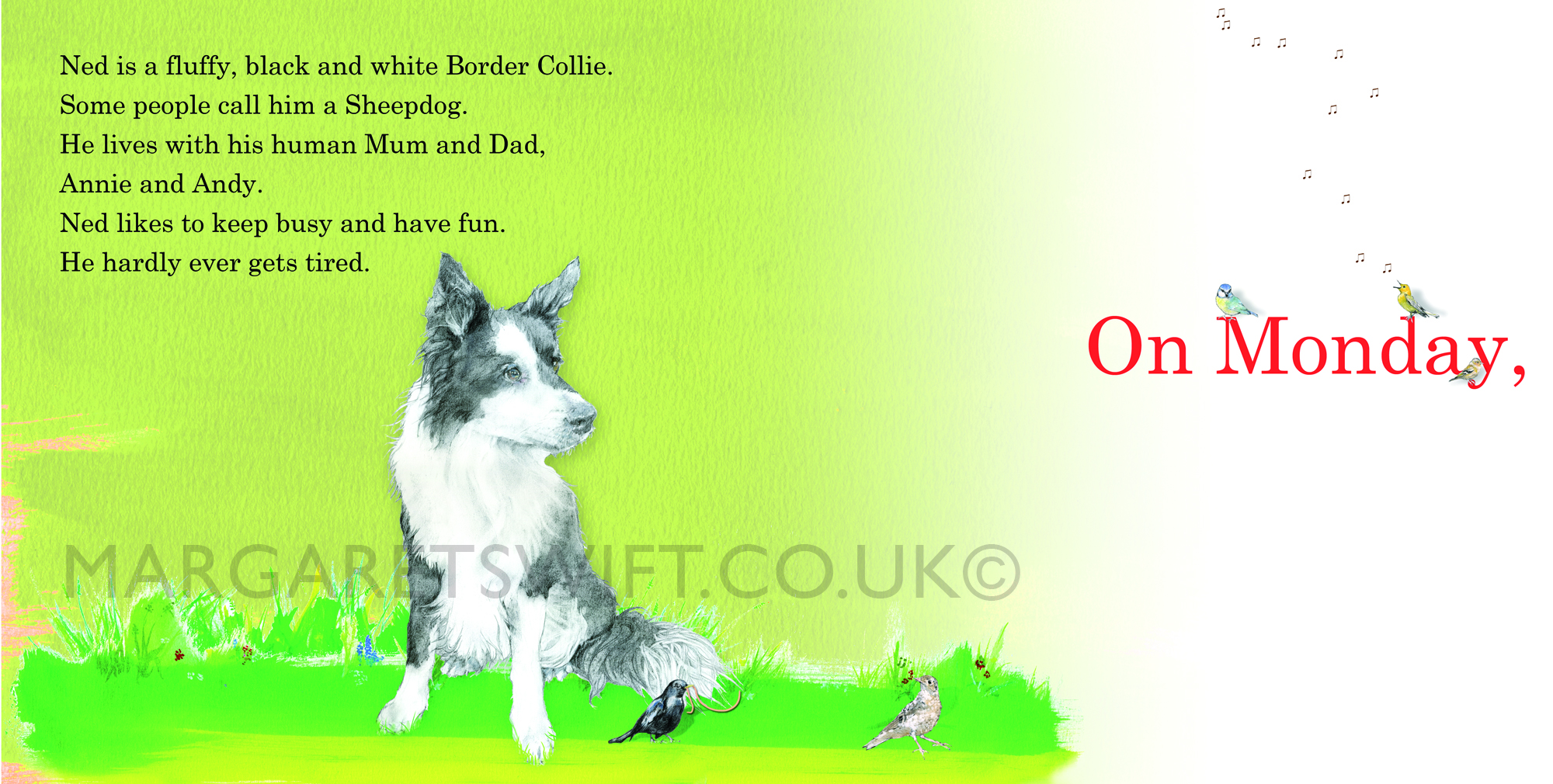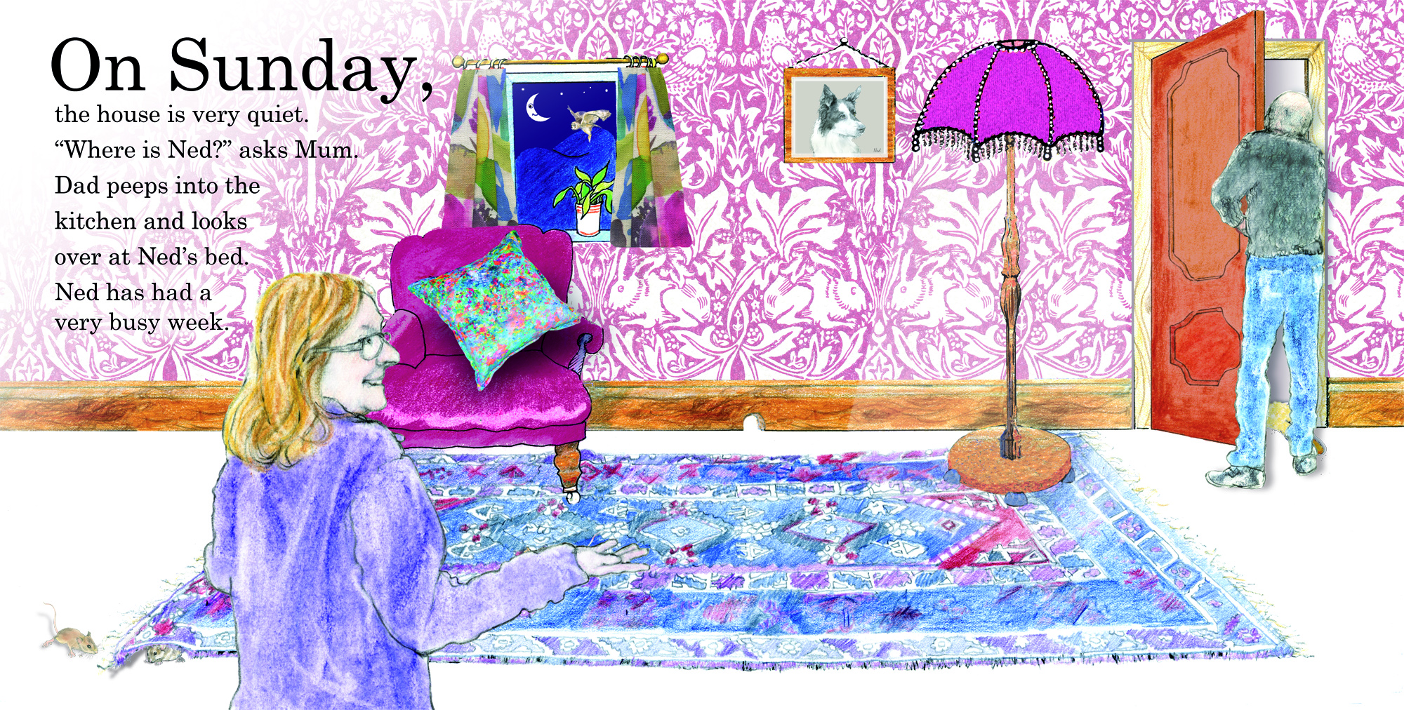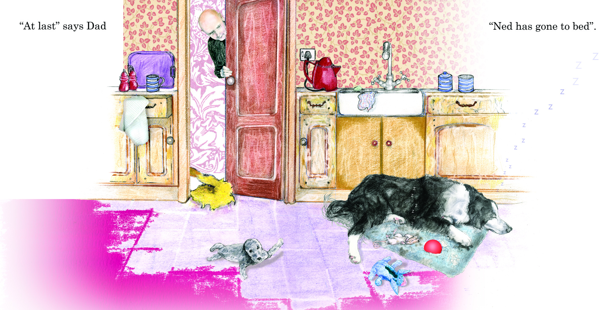 Introducing Ned – the very inquisitive dog who just will not go to bed; his mind is too full of the fantastic things he will be doing tomorrow …